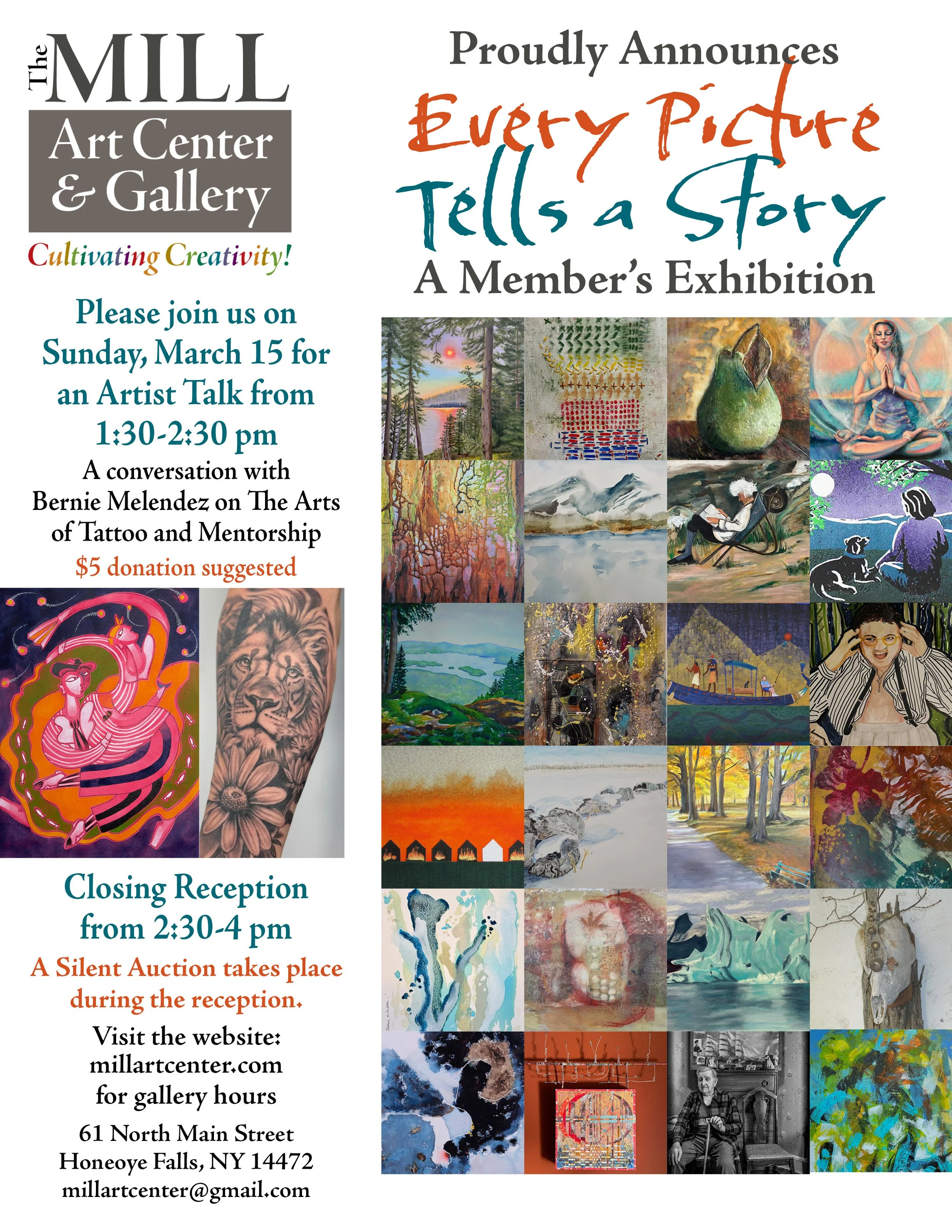 Mill Art Center & Gallery has many events: exhibitions, artist openings, classes for adults and children, workshops, sketch crawls, and Party and Paint parties for adults and children.